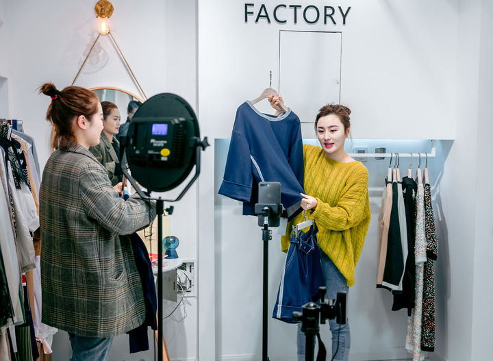 在常熟服装城,商家在进行网络直播销售(资料照片)。新华社发