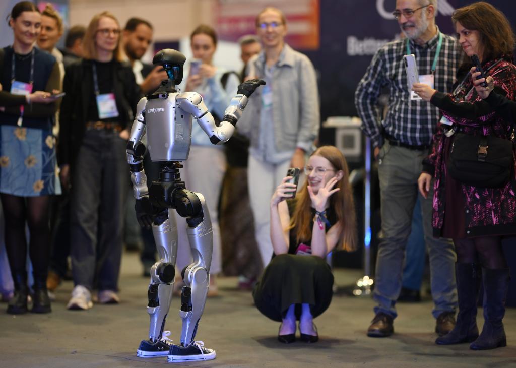 2025年11月12日,在葡萄牙里斯本,中国企业宇树科技的人形机器人和与会者在2025年网络峰会现场互动。新华社发