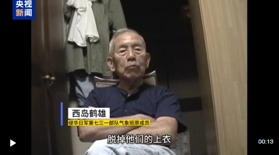 侵华日军第七三一部队气象班原成员 西岛鹤雄:脱掉他们的上衣,让他们光着身子,放在零下20摄氏度甚至零下25摄氏度的环境里,放5分钟或10分钟。