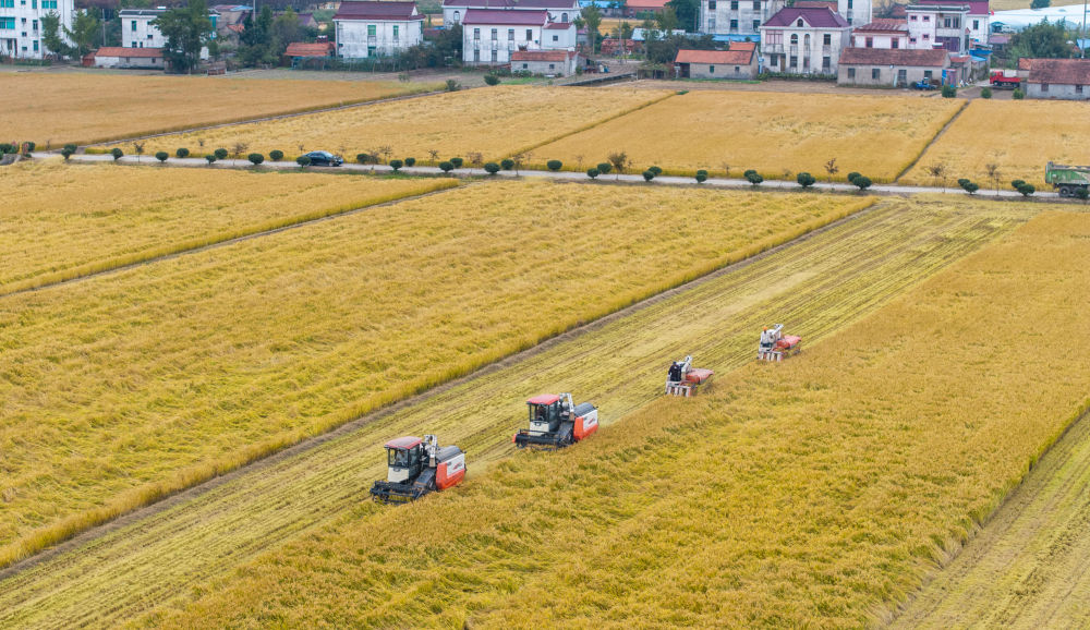 10月30日,在江苏省南通市通州区十总镇育民村高标准农田里,村民驾驶农机收割水稻(无人机照片)。 新华社发(翟慧勇摄)