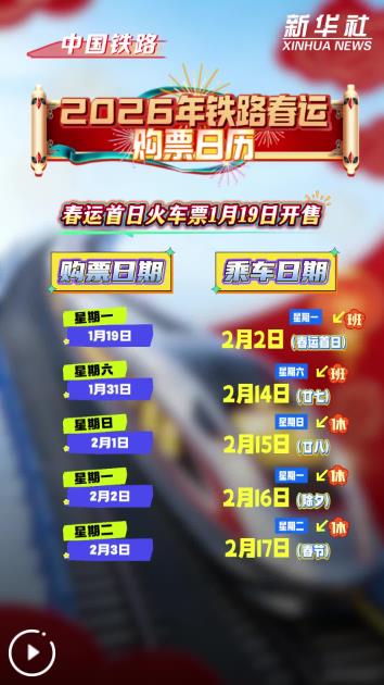 记者1月18日从中国国家铁路集团有限公司获悉,2026年铁路春运自2月2日开始,至3月13日结束,为期40天,全国铁路预计发送旅客5.39亿人次,节前客流高峰日预计为2月13日(腊月廿六),节后客流高峰日预计为2月23日(正月初七),春运首日火车票将于1月19日开始发售。