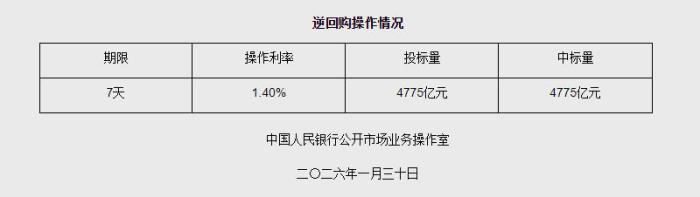 据央行网站消息,2026年1月30日中国人民银行以固定利率、数量招标方式开展了4775亿元7天期逆回购操作。具体情况如下: