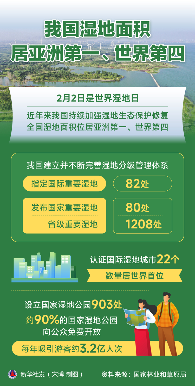 2月2日是世界湿地日。记者当天从国家林业和草原局获悉,近年来我国持续加强湿地生态保护修复,全国湿地面积位居亚洲第一、世界第四,湿地保护形成重点治理和分类保护相结合的新格局。