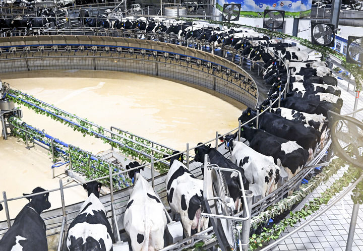 2025年7月28日拍摄的呼和浩特市伊利敕勒川生态智慧牧场挤奶车间。