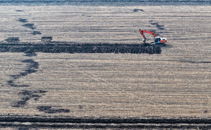 2025年3月11日,在天津市津南区八里台镇大韩庄村,工人驾驶挖掘机进行高标准农田施工作业(无人机照片)。