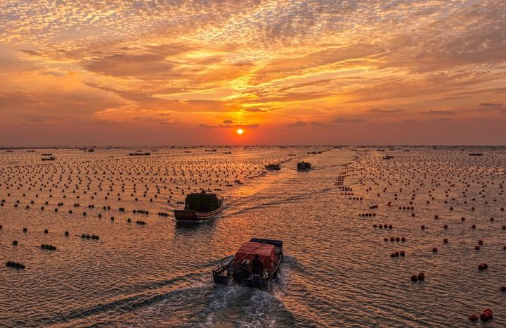 2025年10月24日,在山东省荣成市爱伦湾鲍鱼养殖区,收获鲍鱼的养殖户驾驶船只返回渔港(无人机照片)。