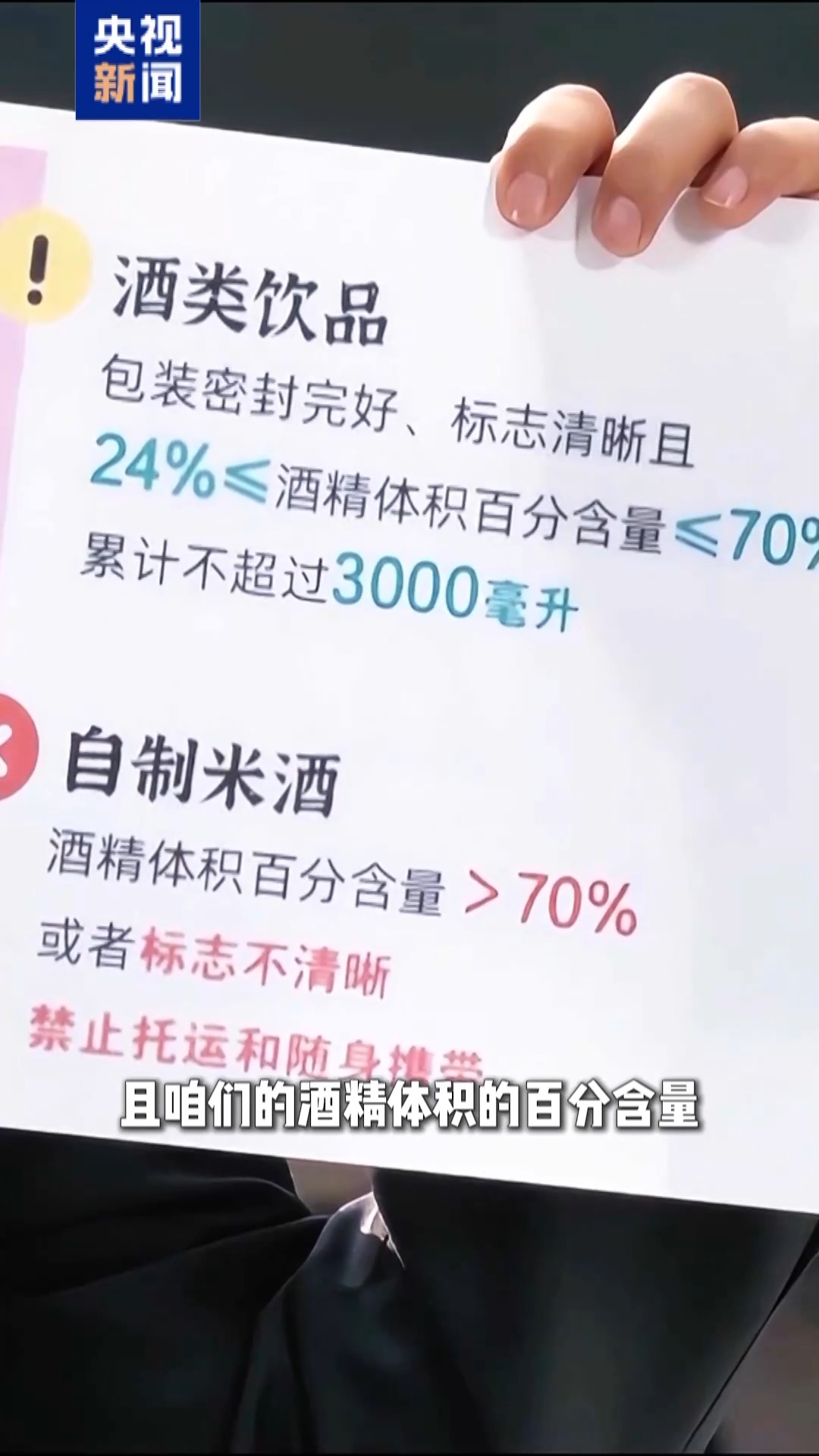 国铁沈阳局长春客运段列车长 刘影:酒能带,但是有几个前提,首先包装要完好,而且标志清晰,酒精体积的百分含量在24%和70%之间,总携带量不要超过3000毫升。