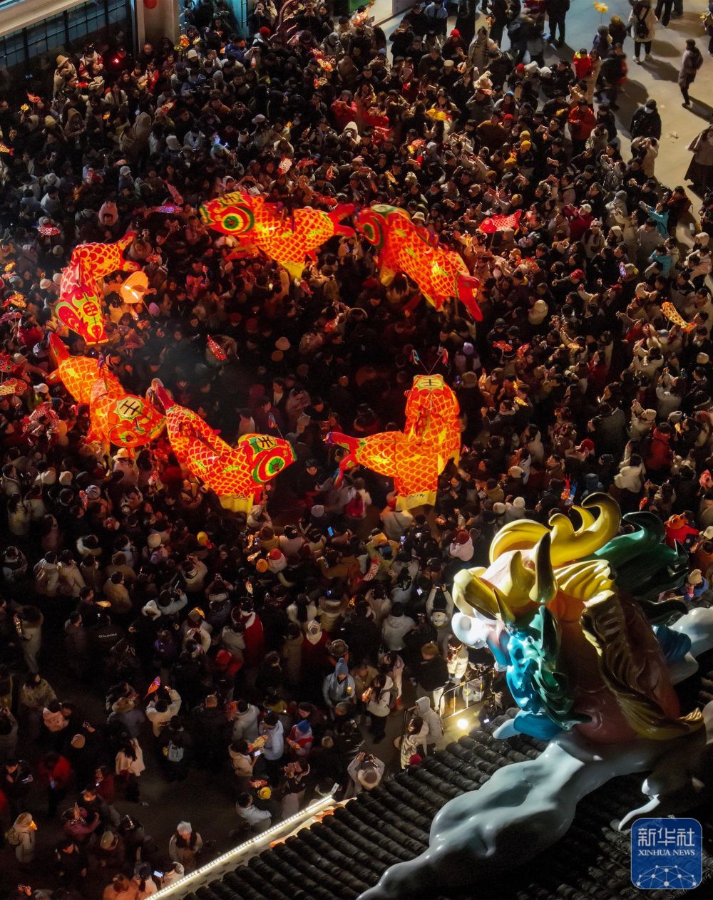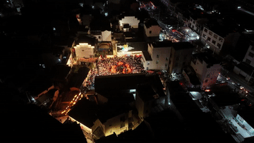 2月7日,瞻淇村鱼灯队在村中表演(无人机照片)。