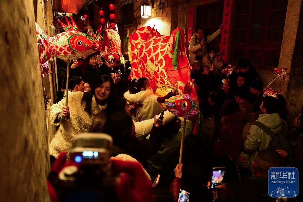 2月7日,瞻淇村鱼灯队在村中表演。
