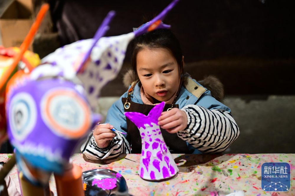 2月8日,小朋友在瞻淇村里体验鱼灯制作。