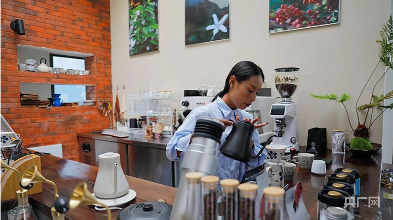 海拔1650米的咖啡庄园里,佤族咖啡师周开艳正在冲泡咖啡(央广网记者 魏文青 摄)