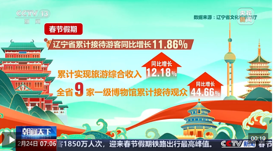 记者从辽宁省文化和旅游厅了解到,春节假期期间辽宁省累计接待游客同比增长11.86%,累计实现旅游综合收入同比增长12.18%。全省9家一级博物馆累计接待观众同比增长44.66%。
