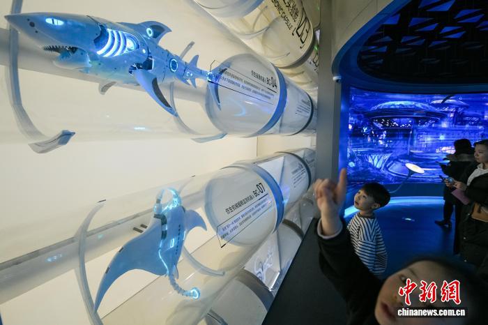 1月30日,游客在位于天津滨海新区的国家海洋博物馆“未来海洋”展厅参观各种海洋仿生机器人。 中新社记者 佟郁 摄