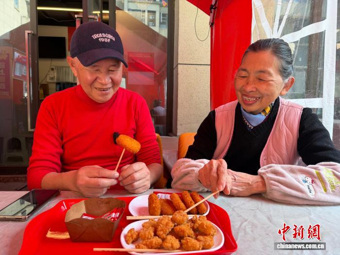 3月11日,台胞刘韦麟(左)与妻子吴微微一边品尝自制的台湾小吃一边聊天。中新社记者 岳依桐 摄