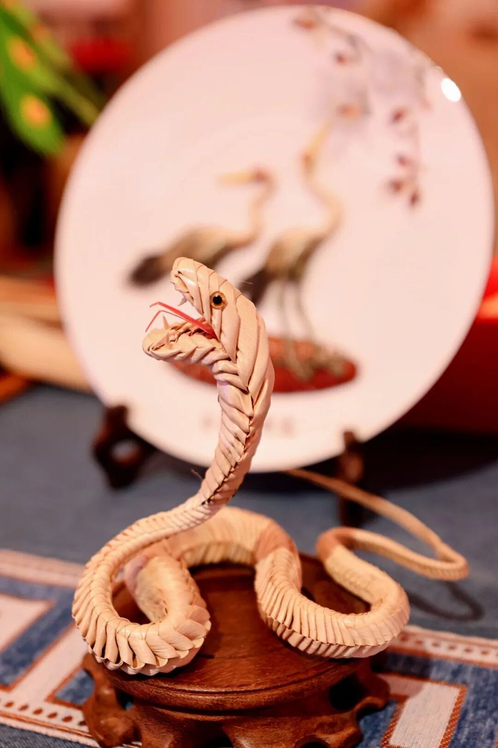罗志勇棕编作品《醒狮》:选用优质棕榈嫩叶经过采叶、划叶、熏叶、泡叶、露叶、晒叶、高温染色、编制等精心制作而成,作品色彩鲜艳,活灵活现。