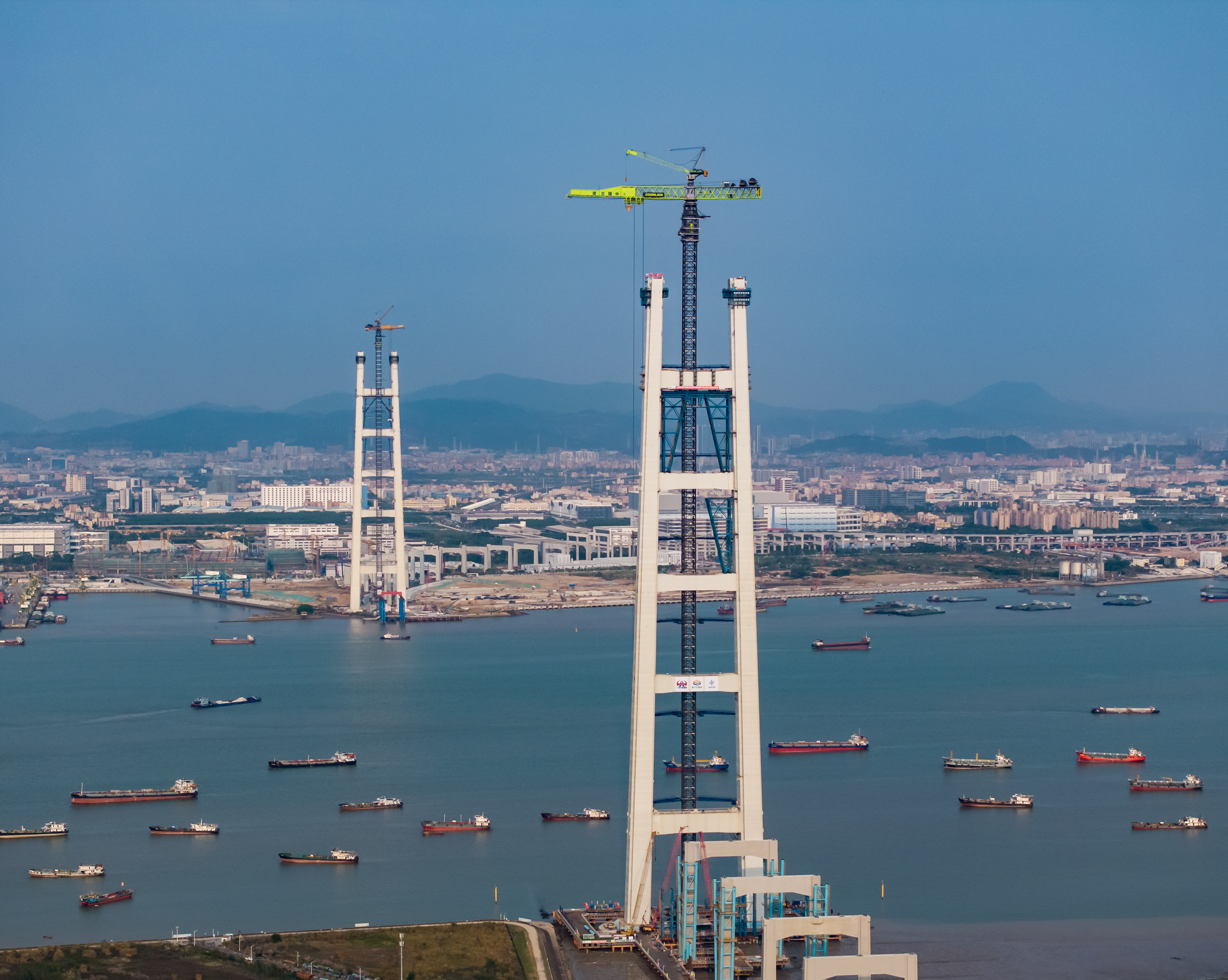 狮子洋大桥主塔高342米,相当于110层楼高,单幅塔肢由62个钢壳节段精准拼装。面对毫米级精度控制、超高施工等挑战,中交二航局项目团队创新攻克多重难题——