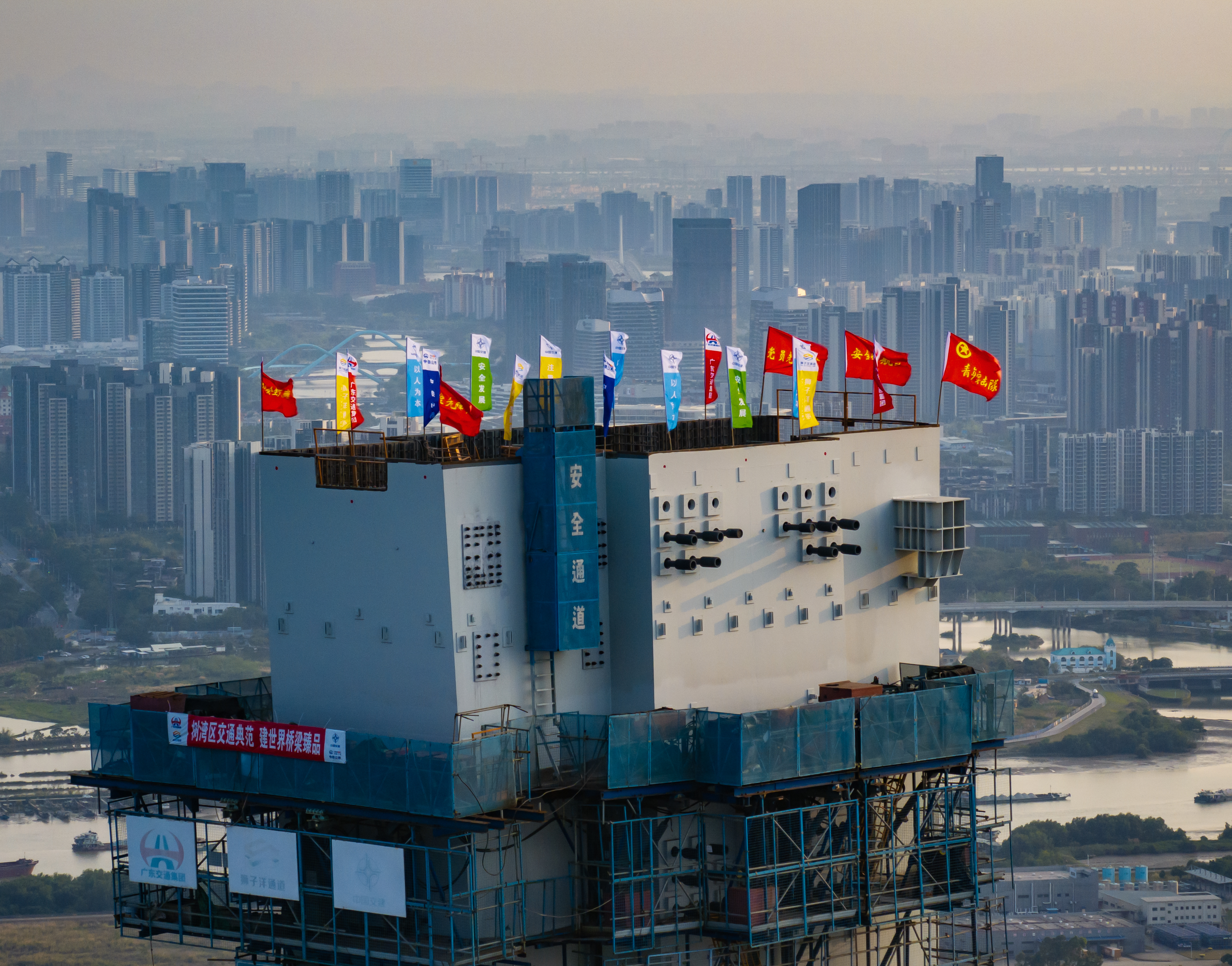 3月26日上午11时,粤港澳大湾区核心枢纽工程狮子洋通道迎来重大进展,其关键控制性工程——狮子洋大桥东、西主塔完成封顶,以342米的凌空高度,一举成为珠江口第一高桥塔、世界最高双层悬索桥主塔。