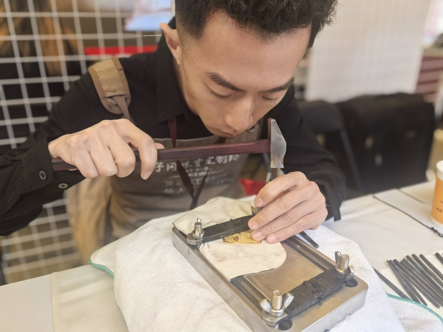 回到现场,95后工匠郭珺文正在演示錾刻——这是打金中最显手艺的环节。錾刻台上,金器被固定,他手持小榔头敲击錾刻刀,“叮叮当当”一点一点敲出纹样。“一般要经过几万次,才能达到预期效果。”他说。摊位前,几位上海阿姨凑近仔细围观,问道:“蛮灵,黄金有损耗伐?”