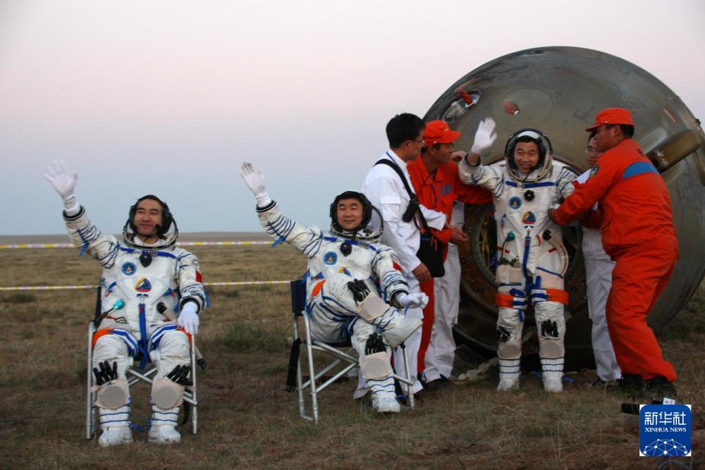 2008年9月28日,神舟七号返回地球,航天员翟志刚、刘伯明、景海鹏(从左至右)自主出舱后向现场搜救人员挥手致意。 新华社记者 王建民 摄