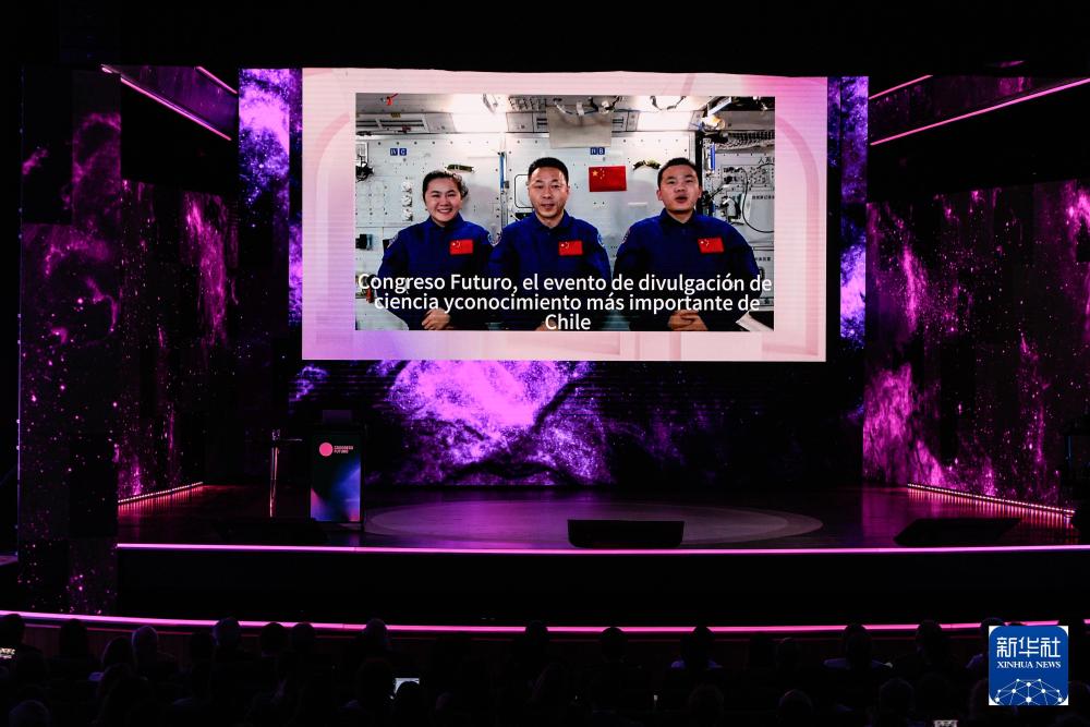 2025年1月13日,智利第十四届“未来大会”开幕式在首都圣地亚哥旧国会大厦内举行,神舟十九号乘组通过视频送上祝福,预祝大会取得圆满成功,并表达了中国和智利及拉美携手探索宇宙奥秘的美好愿望。新华社发(豪尔赫·比列加斯 摄)