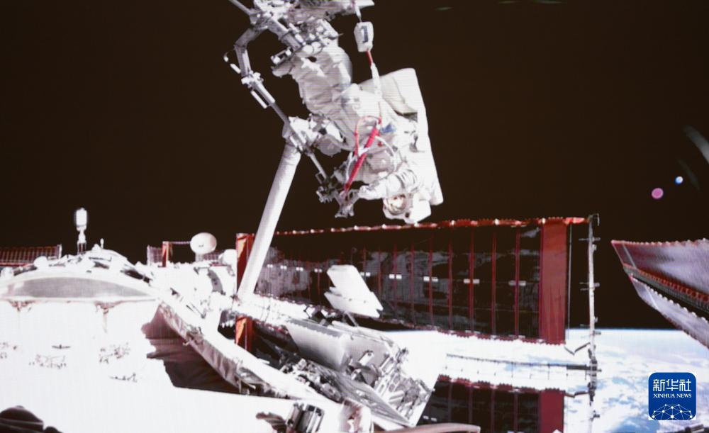 2024年5月28日在北京航天飞行控制中心拍摄的神舟十八号航天员叶光富在空间站组合体舱外作业的画面。新华社记者 李杰 摄