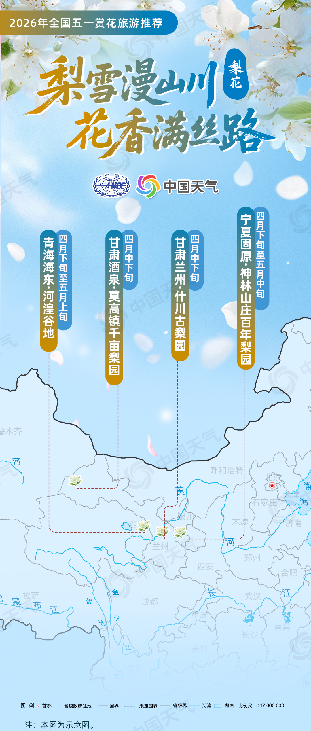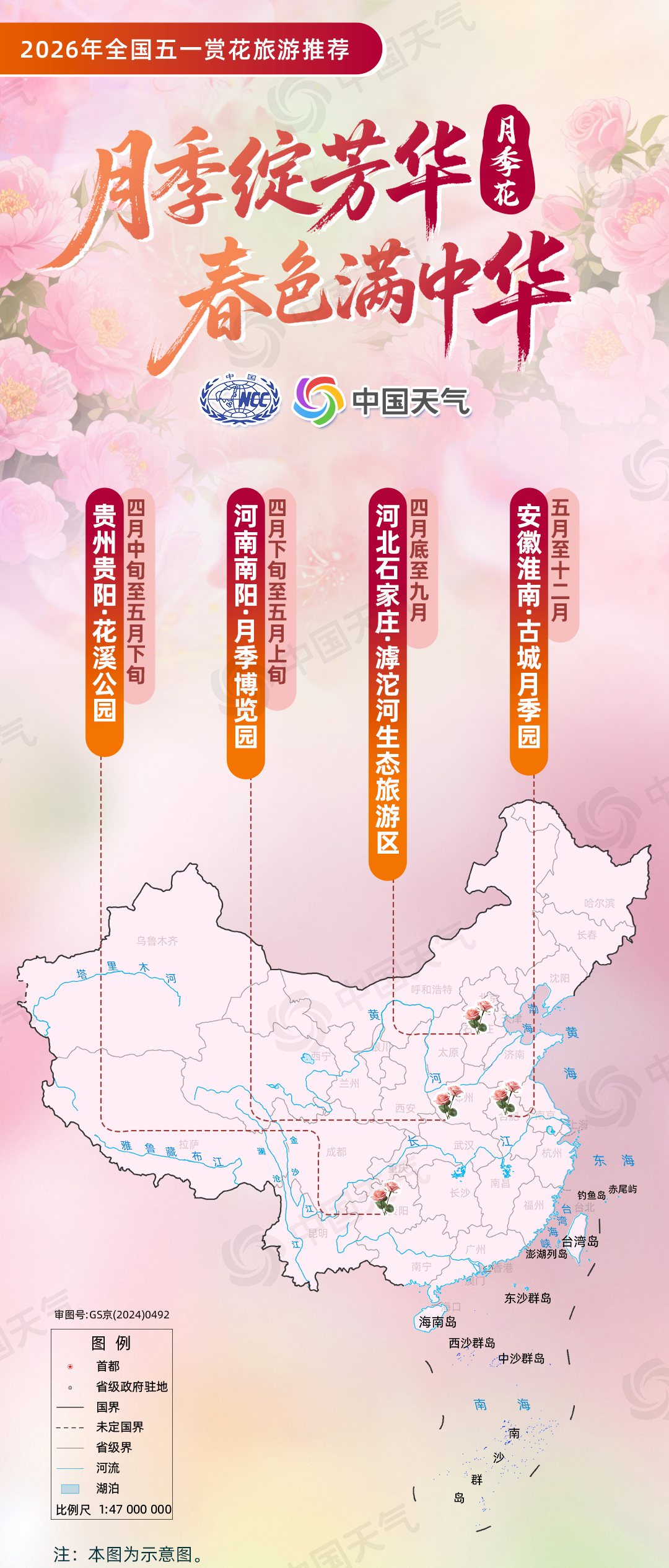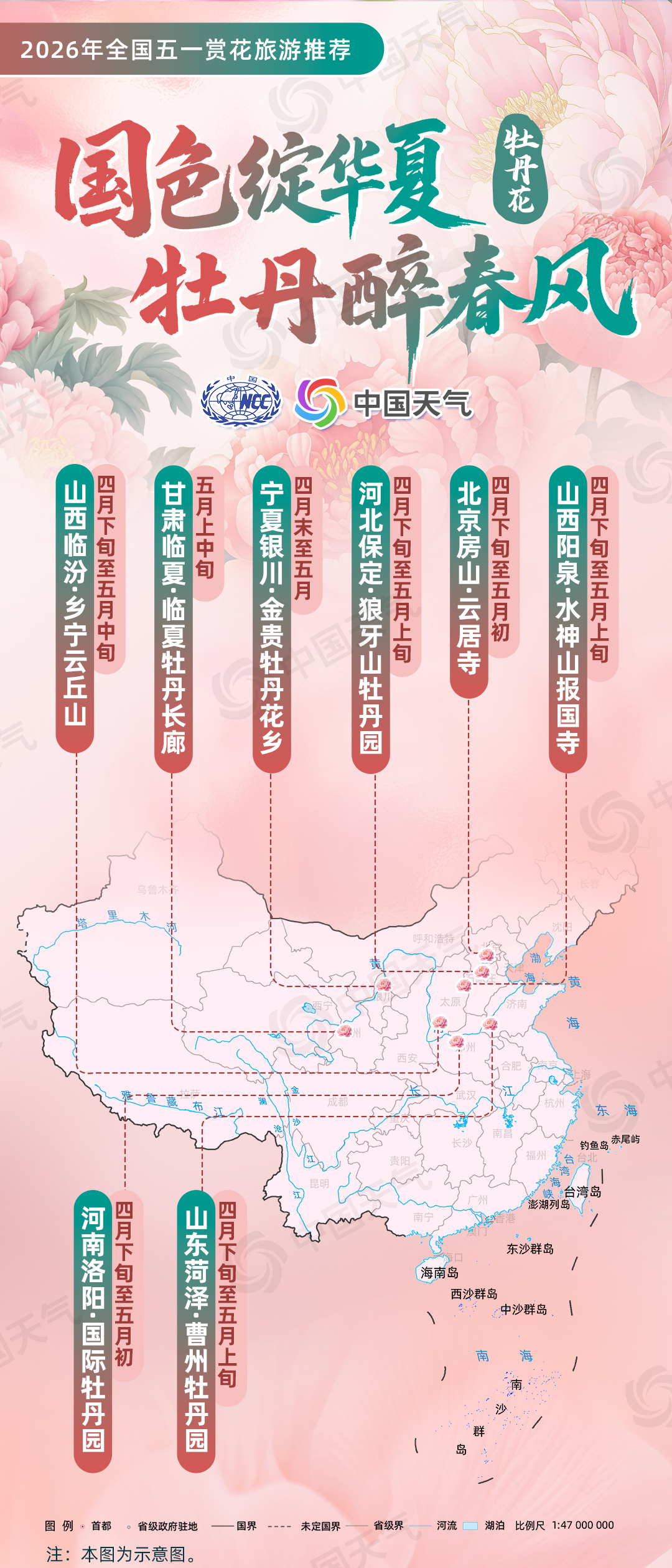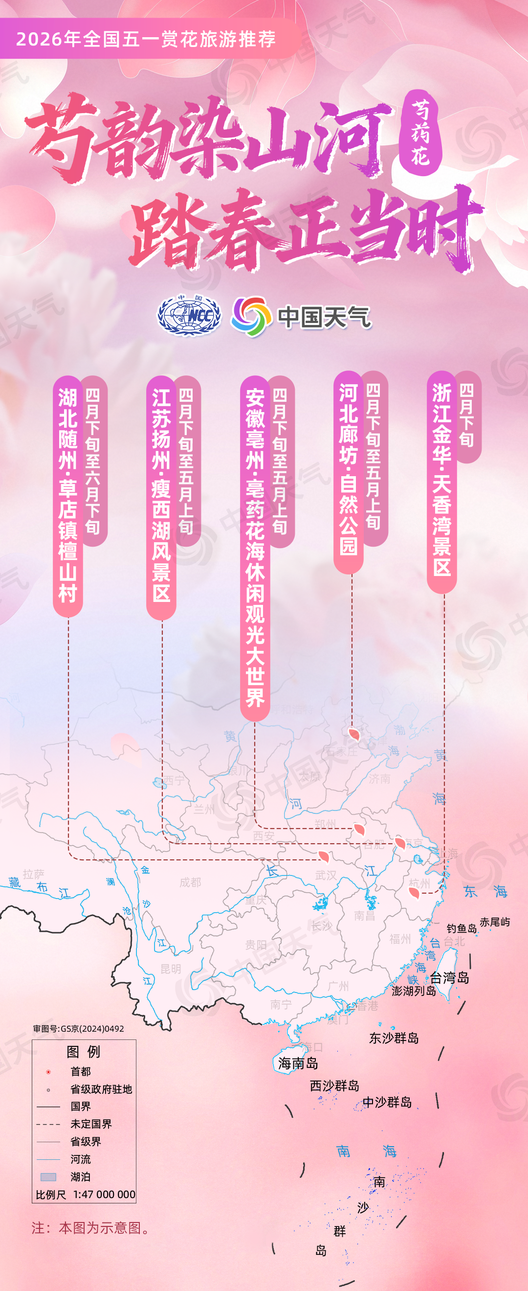 国家气候中心联合华风气象传媒集团结合赏花花品类型、盛开气候条件、4月下旬至5月上旬气候趋势预测等,选出涵盖6大类花品及10种特色花的全国赏花旅游景点作为推荐内容,涉及21个省(自治区、直辖市)的43个地市,包含东北、华北、西北、华中、华东、西南、华南等区域,并结合各地小气候差异定向选点。