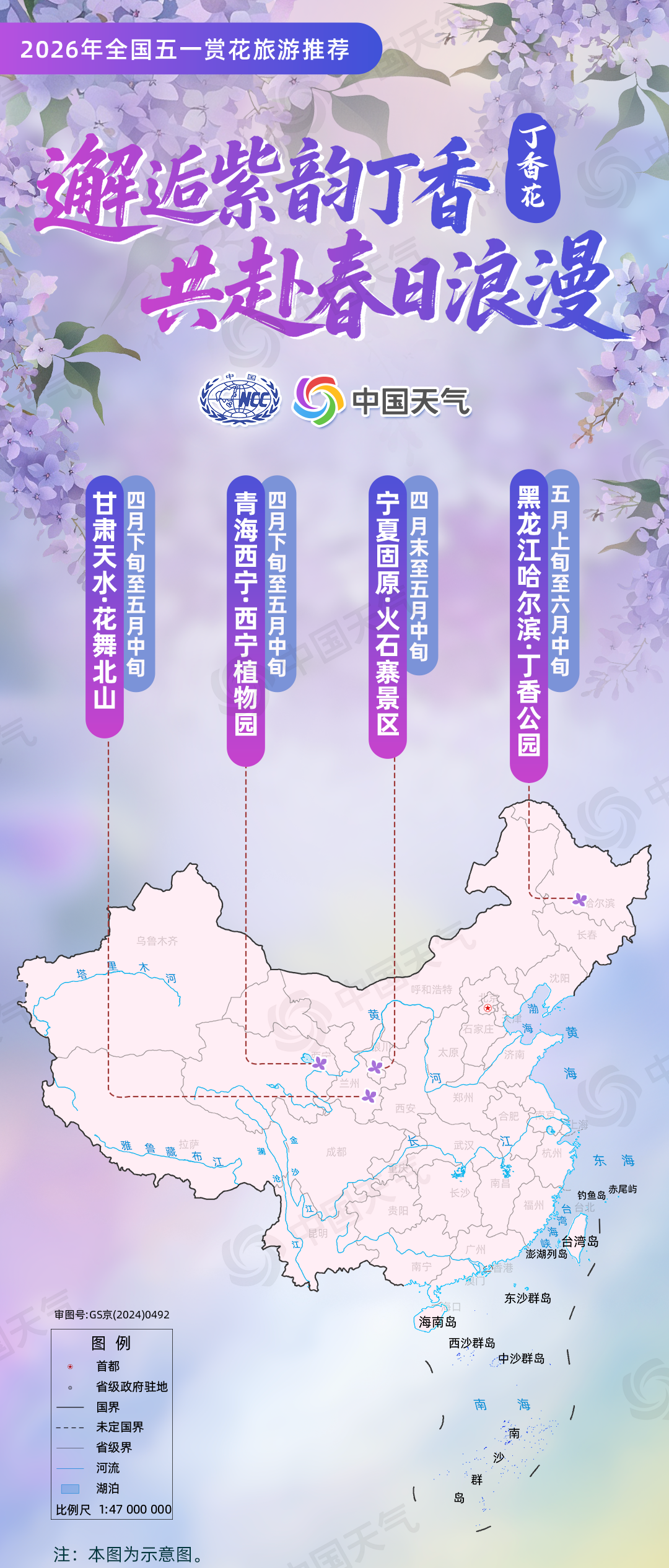 丁香花:“邂逅紫韵丁香 共赴春日浪漫”(黑龙江哈尔滨丁香公园、甘肃天水花舞北山、青海西宁植物园、宁夏固原火石寨景区);