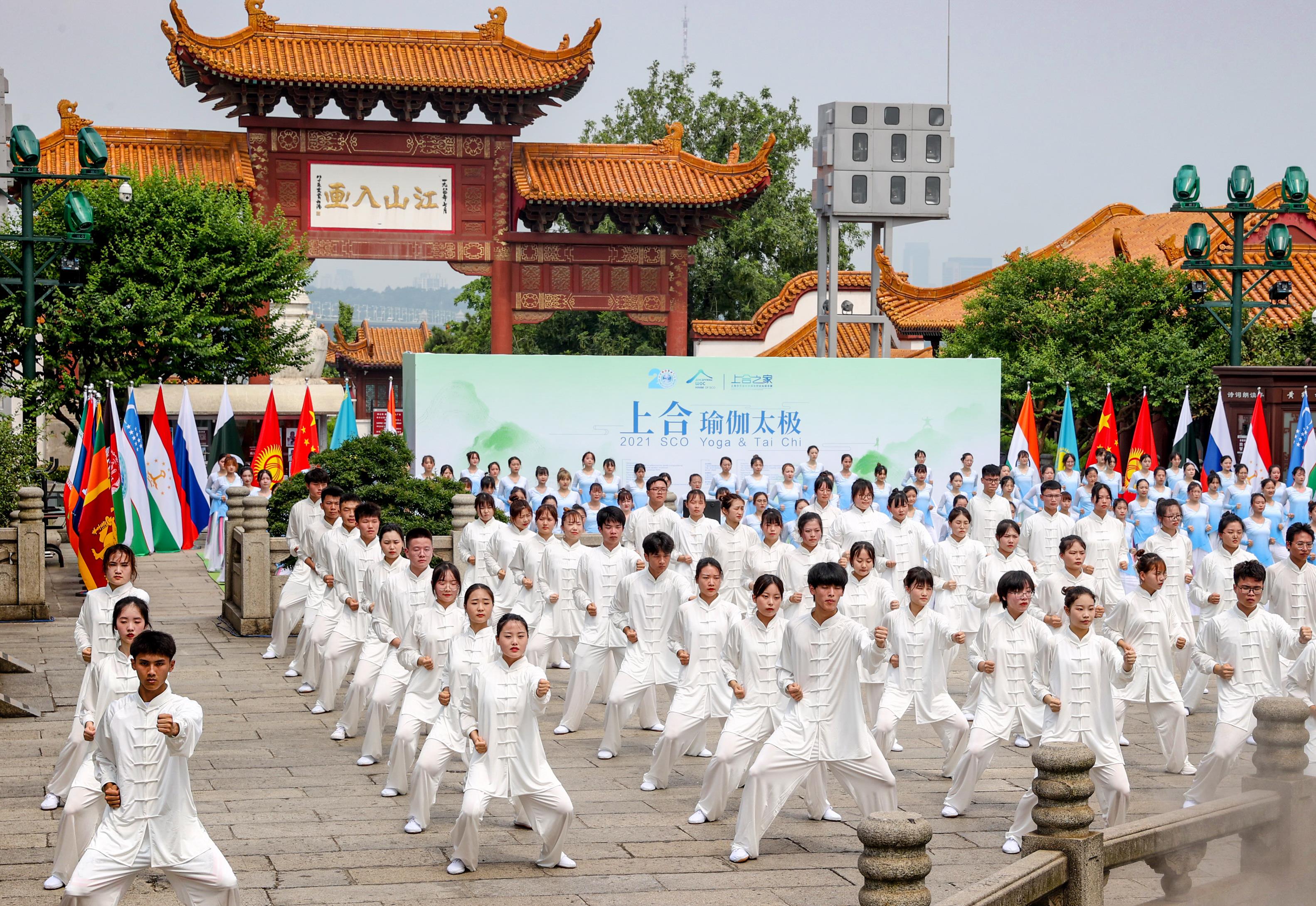 2021年6月2日,湖北大学的学生们为参加上海合作组织民间友好论坛的部分驻华使节及嘉宾进行太极拳表演。