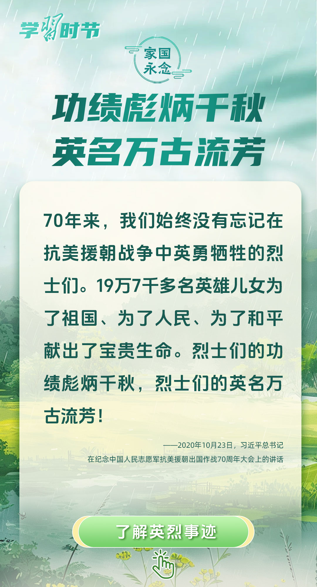 今年是中国人民抗日战争暨世界反法西斯战争胜利80周年、中国人民志愿军抗美援朝出国作战75周年。习近平总书记曾说:“对一切为国家、为民族、为和平付出宝贵生命的人们,不管时代怎样变化,我们都要永远铭记他们的牺牲和奉献。”今天我们所拥有的一切,无不凝结着英雄、英烈们的奉献付出乃至巨大牺牲。