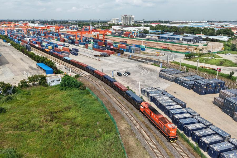 8月27日,一列货运列车驶入位于上合示范区内的中国-上海合作组织地方经贸合作示范区多式联运中心(无人机照片)。新华社记者李紫恒摄