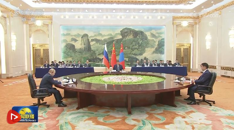 习近平指出,近年来,中俄蒙三方合作稳步发展,取得实实在在的成果。三方合作中期路线图顺利实施,三国贸易额节节攀升,经贸、科技、生态保护、人文合作不断深化。作为山水相连、休戚与共的友好邻邦,中方愿同俄方、蒙方一道,坚守合作初心,排除外部干扰,携手推动三方合作高质量发展。