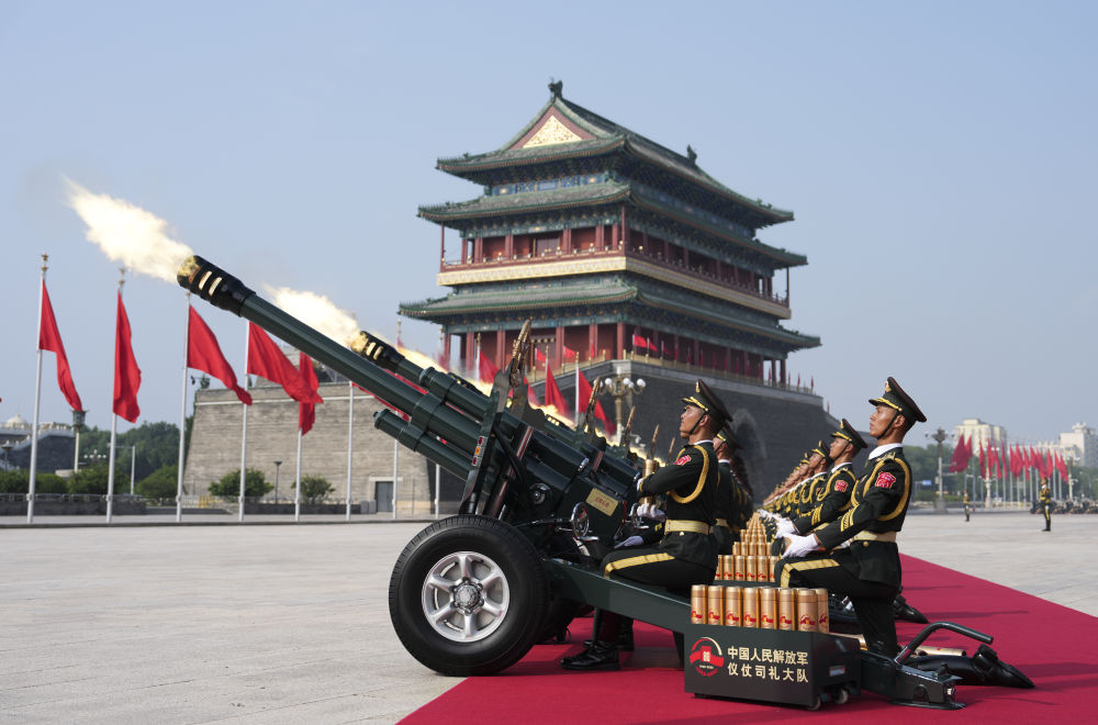 2025年9月3日,纪念中国人民抗日战争暨世界反法西斯战争胜利80周年大会在北京隆重举行。这是礼炮在天安门广场鸣响。