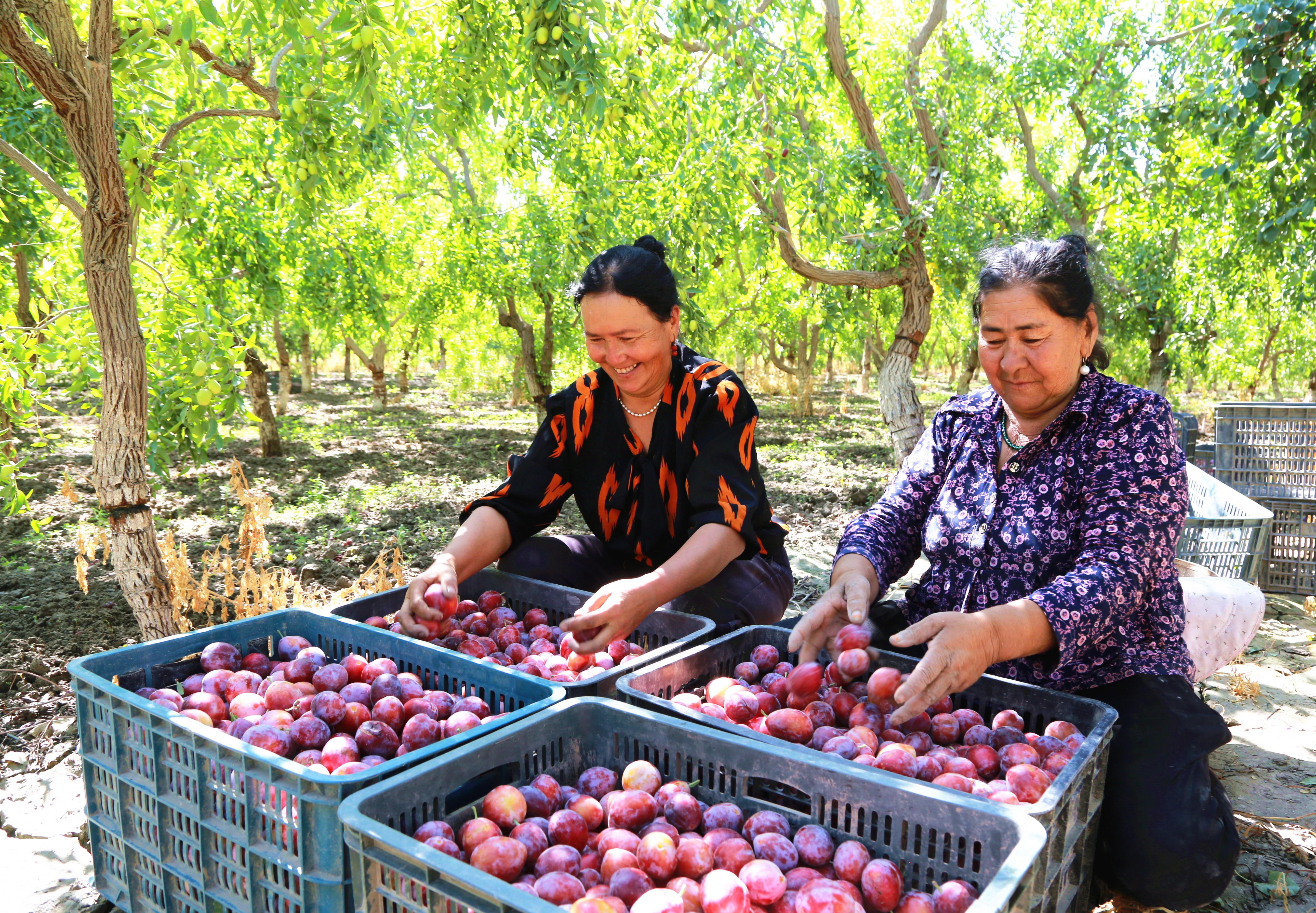 2025年8月19日,新疆阿克苏地区阿瓦提县塔木托格拉克镇阿克亚村,果农分拣西梅。