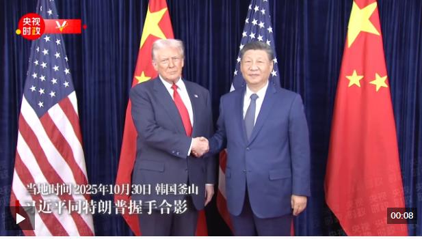 当地时间10月30日中午,中美元首会晤开始前,习近平同特朗普握手合影。