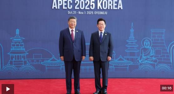 习近平主席抵达时,韩国总统李在明热情迎接。两国元首握手、合影,留下珍贵的“APEC瞬间”。随后,两位领导人微笑交谈,共同步入会场。