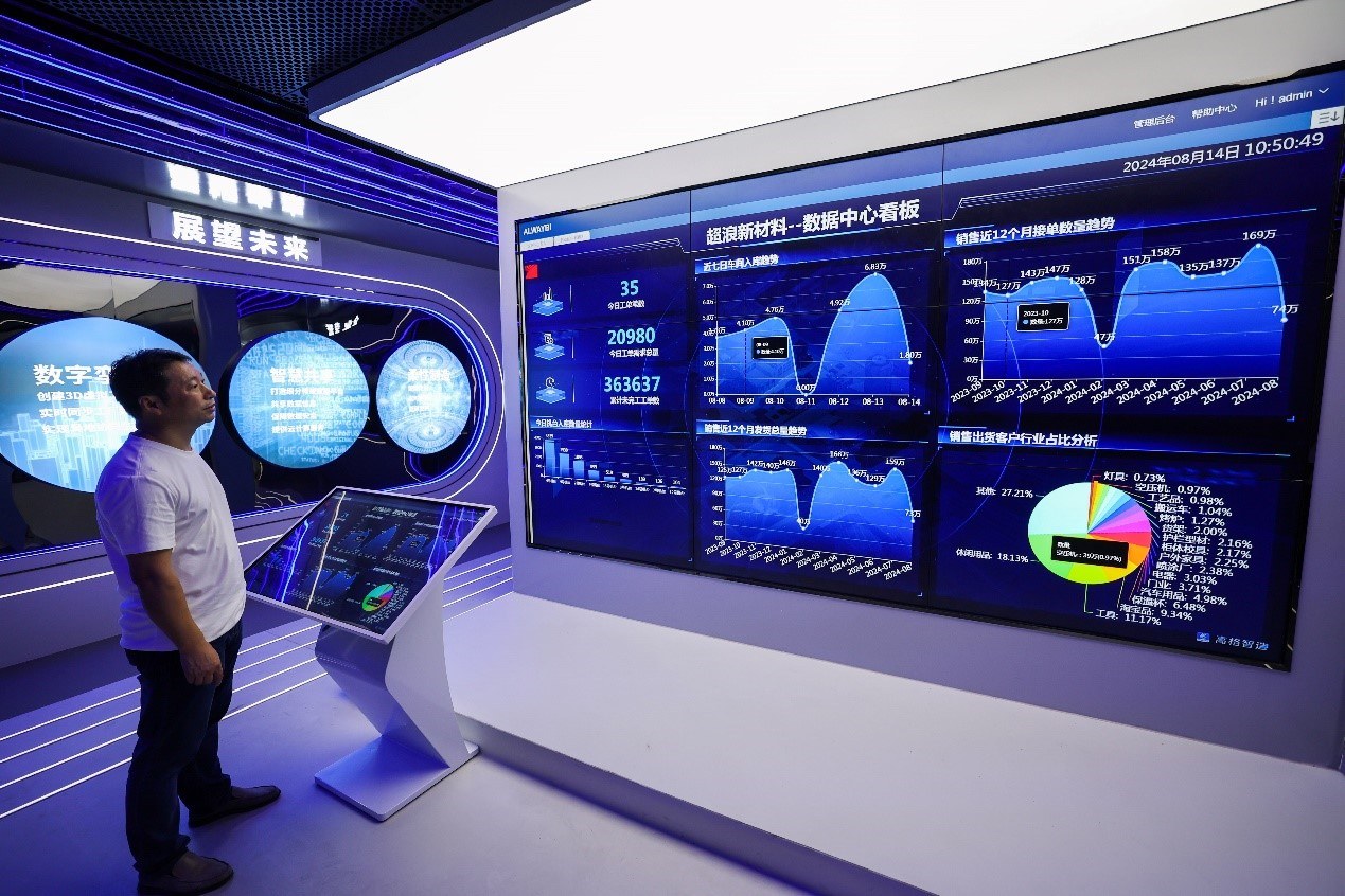 在金华市金东区江东镇的浙江超浪新材料有限公司内,数据中心看板实时显示企业流水线的各项生产数据。新华社记者 徐昱 摄
