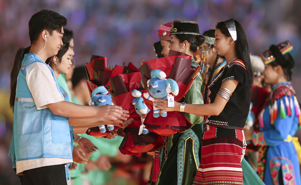 2024年11月30日,五十六个民族代表在海南三亚举行的第十二届全国少数民族传统体育运动会闭幕式上为志愿者献花。运动会期间,数千名志愿者“小鹿鹿”奔赴十余个竞赛场馆、二十多家接待酒店、媒体中心、机场车站等地,为来自全国各地的运动员、技术官员、工作人员和观众提供礼宾接待、交通引导、安全保卫等志愿服务。