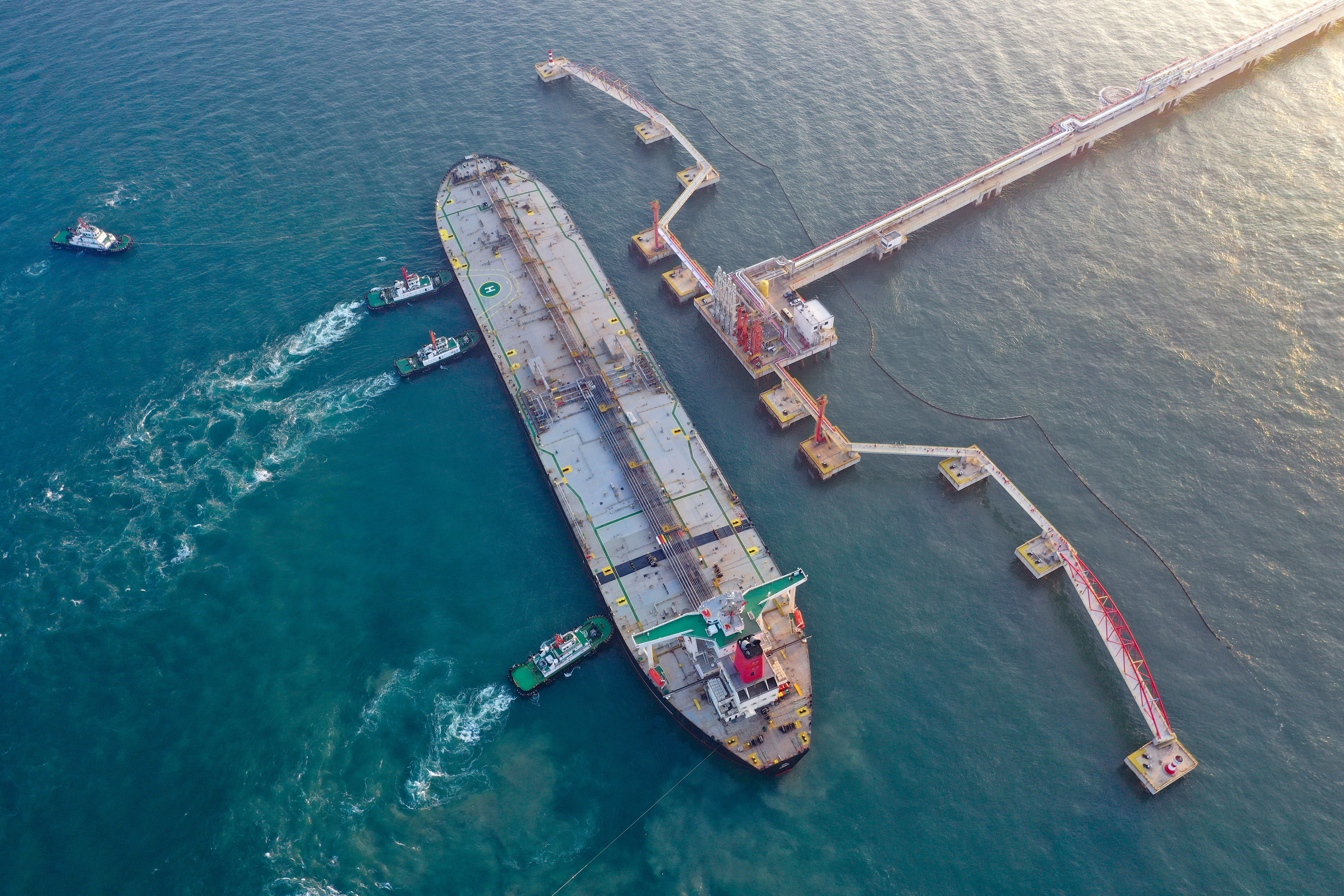 2025年12月18日,一艘装载着17.9万吨石化原辅料的船舶泊入位于海南省儋州市的国投洋浦油储码头30万吨级原油泊位(无人机照片)。