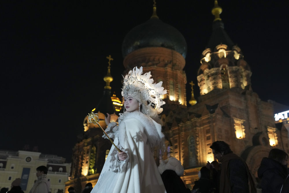 2024年12月20日,两岸青年游客在哈尔滨一冰雪景区内拍照留影。