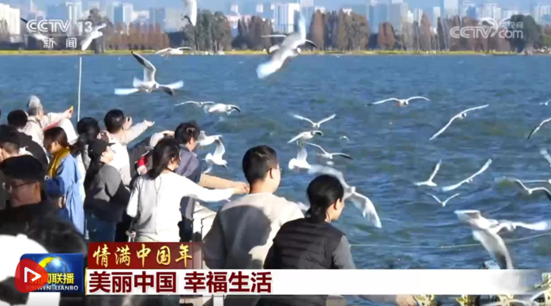 春节假期,云南昆明滇池沙鸥翔集、碧波荡漾,在紧邻滇池的福保社区,人们跳起民族舞蹈,喜迎八方来客,共赏滇池生态美景。