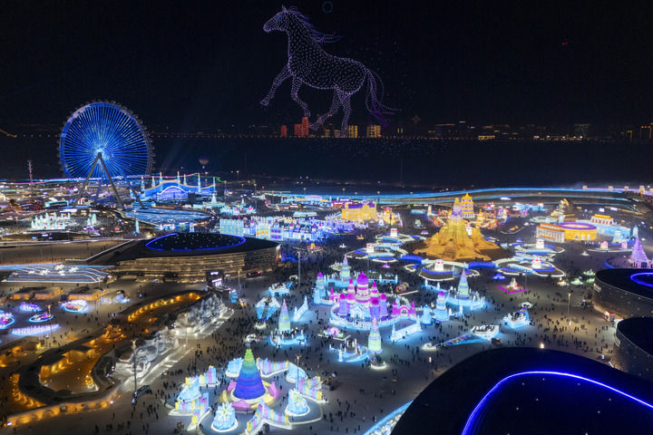 这是2026年1月5日拍摄的哈尔滨冰雪大世界园区的无人机表演(无人机照片)。