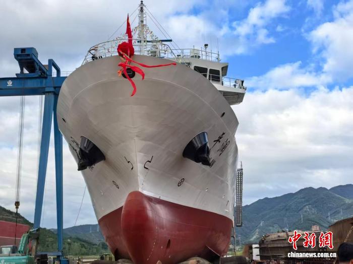 23日,中国首艘民间远洋医疗救援船在浙江台州临海市举行下水仪式。张煜欢摄