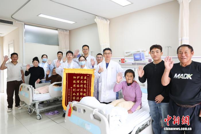 64岁的姐姐次仁忠嘎和56岁的妹妹丁增,在南开大学附属北辰医院骨关节科接受了机器人辅助下双侧全膝关节表面置换术,术后家属为该院医护团队献上哈达及锦旗。(南开大学附属北辰医院供图)