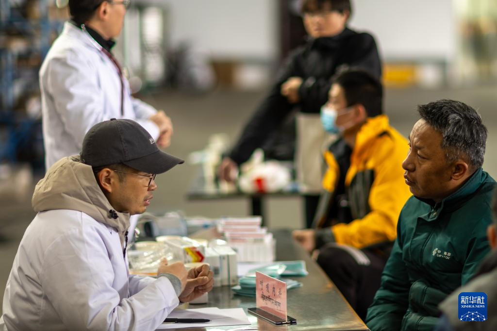 3月13日,来自首都医科大学附属北京中医医院的专家李享(左一)为快递从业人员义诊。新华社记者 姜帆 摄