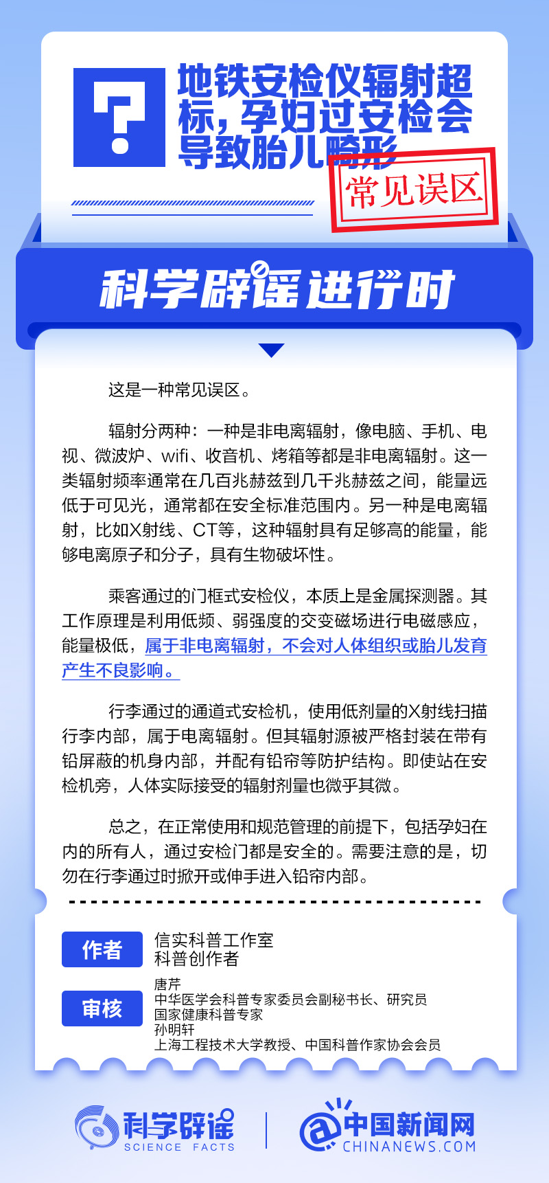 乘客通过的门框式安检仪,本质上是金属探测器。其工作原理是利用低频、弱强度的交变磁场进行电磁感应,能量极低,属于非电离辐射,不会对人体组织或胎儿发育产生不良影响。行李通过的通道式安检机,使用低剂量的X射线扫描行李内部,属于电离辐射。但其辐射源被严格封装在带有铅屏蔽的机身内部,并配有铅帘等防护结构。即使站在安检机旁,人体实际接受的辐射剂量也微乎其微。在正常使用和规范管理的前提下,包括孕妇在内的所有人,通过安检门都是安全的。(来源:@科学辟谣 中国新闻网微博)