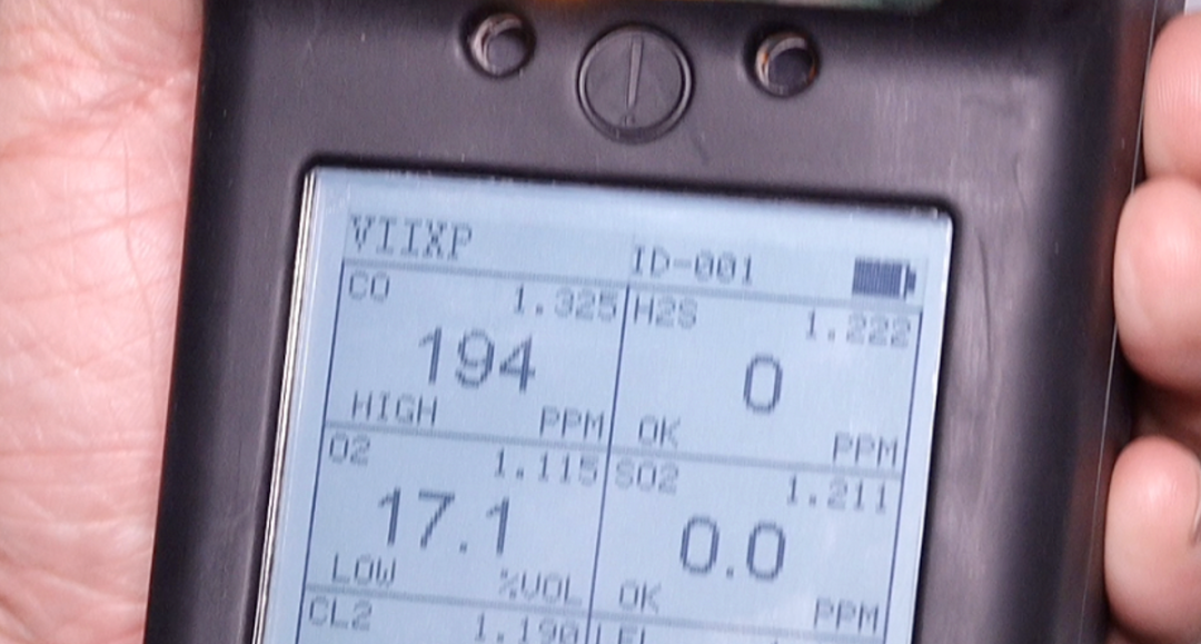 在牛街街道消防站后厨里,消防员关闭门窗,点燃炉灶。仅几分钟左右,检测仪中氧气的含量逐渐降低,一氧化碳指数快速上升,仪器均亮灯报警。