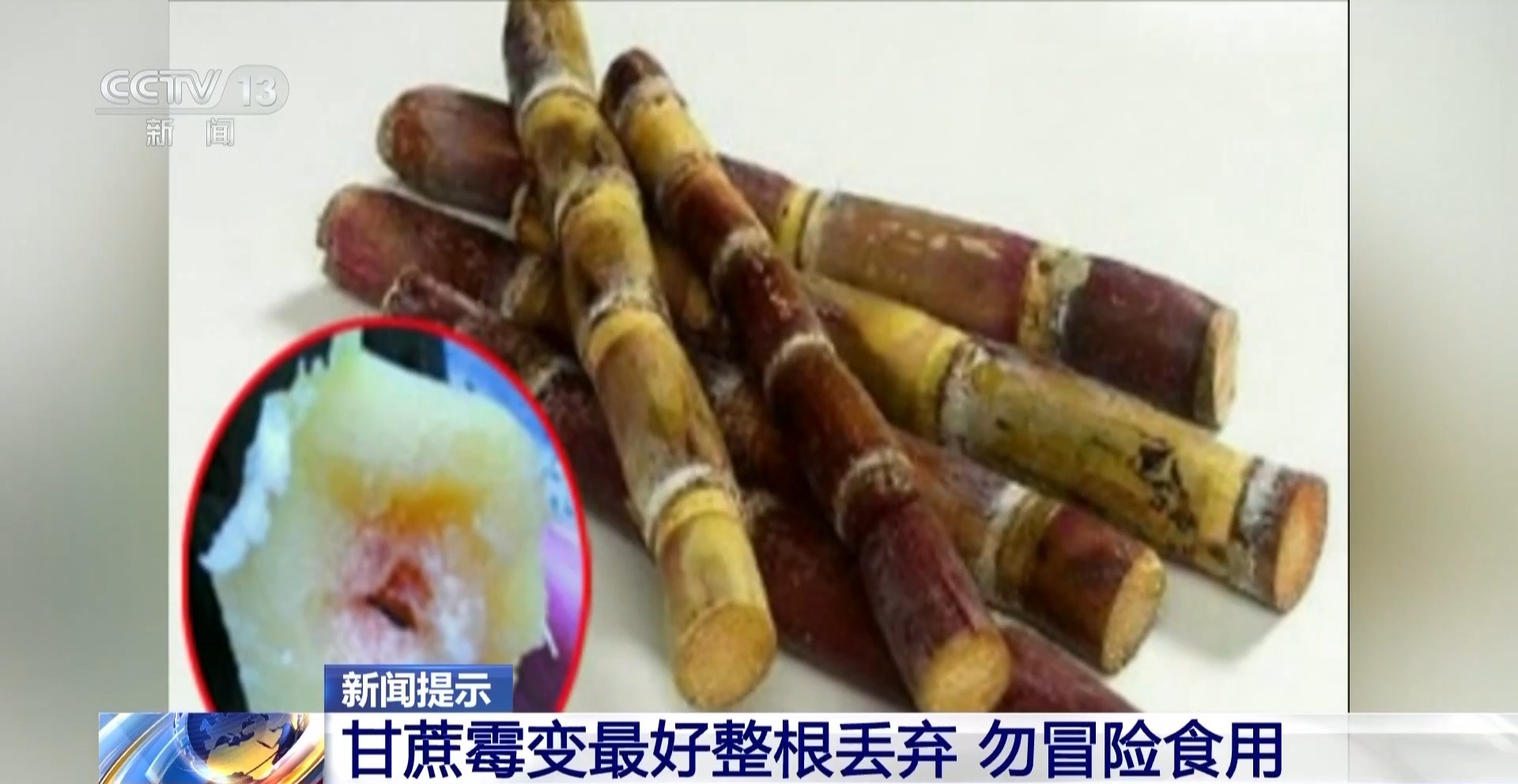 中国农业大学食品科学与营养工程学院食品营养系教授 范志红:在榨汁的时候,可能有一些霉变的甘蔗成为“漏网之鱼”,霉菌的毒素有可能混到甘蔗汁中,所以说喝小摊上榨的甘蔗汁时要非常小心,尤其在现在这个季节,因为甘蔗霉变率较高。除了节菱孢霉产生的毒素外,假如榨完汁以后,又在室温下放了很长时间,在这个过程中也会长细菌。