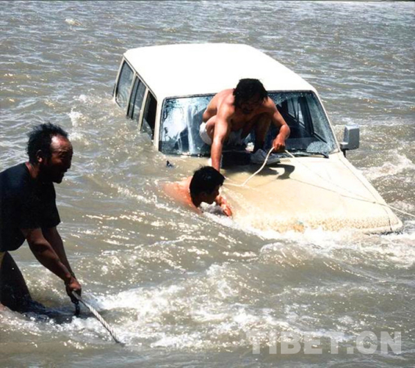 图为1994年,李永宪(中)、丹扎(左)、旺堆次仁在拯救翻进河水中的考古队的车