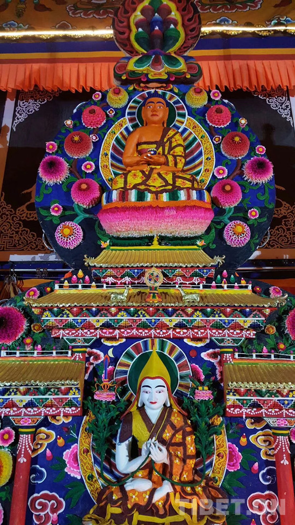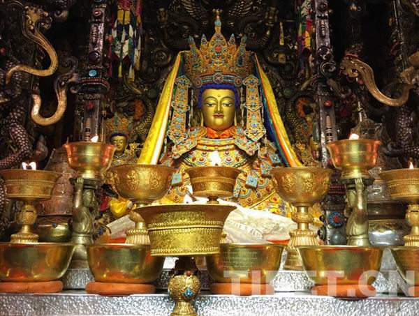 酥油花是雕塑艺术的一种特殊形式。相传,文成公主进藏时带去的释迦牟尼佛像起初并没有佛冠。宗喀巴大师学佛成功后,在佛像头上献上了莲花形的护法佛冠,还供奉了一束“酥油花”,这就是酥油花最早的来历。至今,宗喀巴大师的诞生地塔尔寺每年到藏历正月十五还会展出酥油花。图为大昭寺释迦牟尼像。