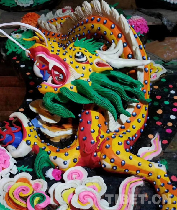 在众多形象生动的造像中,龙的形象尤为引人注目。龙是中华文化的图腾之一,藏地的雕刻、建筑上也不乏龙的形象。在藏族文化中,也有许多有关龙女的神话故事。圣城拉萨的布达拉宫后面就有个美丽的人工湖,名叫龙王潭。湖中有座湖心岛相传是龙女的王宫。图为酥油花雕刻的龙。